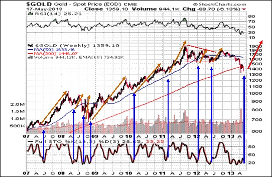 There is another reason we believe Gold is bottoming, and that is the position of the Weekly Full Stochastics, shown below. The current levels are supportive for a bottom in Gold soon, and the start of a powerful rally.