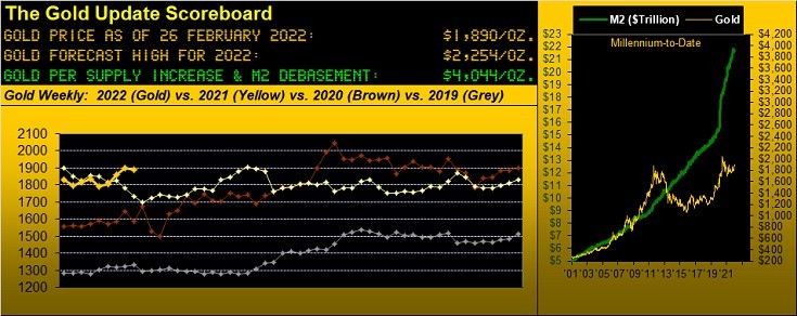 That stated, over the years we've put forth that Gold "ought" rise in tandem with currency debasement, which it did magnificently through the first decade of this 21st Century. And obviously by the opening Gold Scoreboard, Gold is priced today at but one half its valuation. We do not relish Gold rising on geo-political events, the worst of which is war. However, repulsive as that is, we're detecting (to use a modern-day wokey word) a renewed Gold "awareness". To be sure, repugnant as 'tis, "everybody says" that the Russian invasion of Ukraine has kept Gold's price aloft. But "everybody says" also now that 'tis not just the war boosting Gold. Well, "everybody" may be a bit of an exaggeration, but: the buzz today is that Gold ought be higher anyway because of ... (wait for it) ... "inflation and all the money that's been printed." Did "everybody" just figure that out now? We're not holding our breath, but: should price continue to beat a near- term retreat, 1854-1779 shows as structural support from which our 2254 forecast high for this year may indeed well appear.