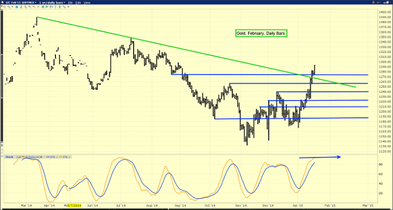 Here is another look at the daily gold chart. Note the green trend line. The breakout above that line will attract a large number of technicians and momentum-oriented hedge funds.