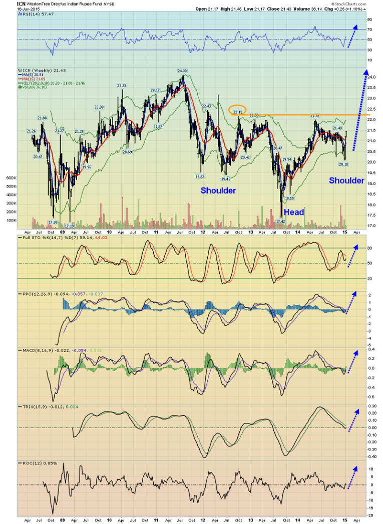 There’s a massive inverse head and shoulders bottom pattern in play, and most indicators and oscillators are flashing beautiful buy signals. I’m predicting the rupee will become the most powerful fiat currency, in the history of the world. The dollar might be able to put a “whuppin’” on a reincarnated Greek drachma, but against the franc and the rupee, it looks ready to incinerate.