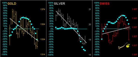 We're merely making mention of this as in our prior two weekly missives we've pointed to Gold's "near-term path of lesser resistance [being] lower" and that the "near-term -- strictly technical read -- is mildly bearish." Which is exactly what Gold has been reflecting, even in the face of yesterday's momentary Fed Chair fundamental flier up to 1346, which then fizzled. For as we turn to the following three-panel graphic of the last 21-trading days for Gold, Silver, and the Swiss Franc, (the latter's Friday fallout representative of the Dollar's seventh strongest session year-to-date), the negative writing for the precious metals has been on the wall these past few weeks. And the "Baby Blues" -- those dots which measure the day-to-day consistency of the 21-day linear regression trends (diagonal grey lines) -- pointed the way, their en route having run out of puff, thus abetting these lower levels: