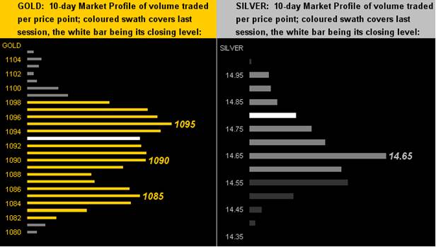 We'll wrap it up here with the Precious Metals' 10-day Market Profiles, plus a few quick hits on the way out. Below we've Gold (left) enveloped in a fairly narrow thicket of trading support and resistance spanning between 1085 and 1095, whereas for Sister Silver (right), at 14.80 she is a nice bevy of pips above her 14.65 resistor. Still, "narrow" indeed as we glide toward August's Dog Days ahead of the September Storm: