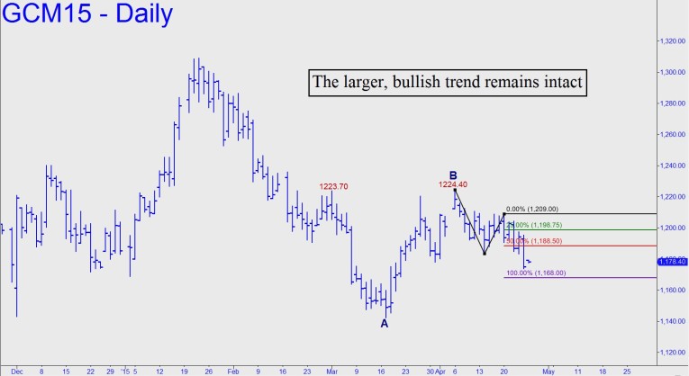 Relative to the low at 1142.40 recorded March 17, June Gold remains in a bullish trend that it has been correcting for the last three weeks. What validates this interpretation is that early April’s 1224.50 high slightly exceeded a prior peak at 1223.70 recorded on March 2 (see inset). That makes the entire rally picture since March 17 low bullishly impulsive, although recent weakness has created a bearish impulse leg of lesser degree. This is ‘dueling’ impulse legs, and for the moment, the bullish one still holds sway. Even so, there’s an outstanding correction target at 1168.00, and this Hidden Pivot support must hold if we are going to give bulls the benefit of the doubt. More bullish still would be a rally Sunday night that exceeds 1181.50, an event that would turn the two-minute chart bullishly impulsive. A bc-type pullback from just above that number would presumably be tradable via ‘camouflage’ and entail theoretical entry risk of perhaps 0.40-0.60.