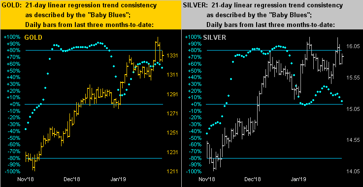 Speaking of Gold here is our two-panel chart of the yellow metal on the left for its daily bars of the past three months-to-date along with the baby blue dots of linear regression trend consistency -- or of late lack thereof -- with same for the white metal on the right. As we've been so fervently detailing, Gold has had a terrific run, indeed this past week tapping 1349, a mere 28 points away from the critical upside target at Base Camp 1377. But we have to think the "Baby Blues" are suggestive of the precious metals getting a case of the blues such that Gold's parabolic Long trend now 24 weeks old shall likely soon fold: