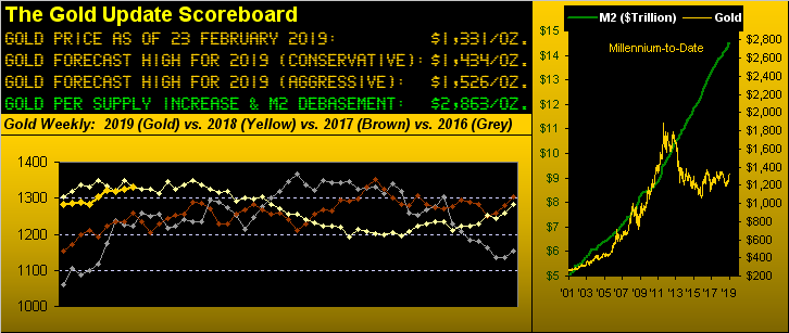 Still, despite the above truths, we're told that Americans are the most financially optimistic they've been in some 16 years and are as upbeat as ever about retirement. But according to NerdWallet: "For households headed by someone age 75 or older, the median value of retirement holdings is $120,000, with an average holding of $336,500." 'Course the average is skewed well above the median by all those evil rich people out there that are in the crosshairs of the bazillion or so Democrat candidates running for President next year. But let's say you're right at that $120,000 median, (which for you West Palm Beachers down there is the mid-point of all the retirement holdings). Safely invested at 3% per annum, that yields you $7,200/year, i.e. $600/month. But don't forget your Social Security check, for which according to Investopedia "...the estimated average monthly benefit for 'all retired workers' in 2019 is $1,461..." So let's do the math: $600 + $1,461 = $2,061 of monthly income. Good luck. And when the money runs out either at home and/or for the entirety of the Social Security Trust Fund, the requisite monetary printing to keep us oldsters upright shall skew the price of Gold up into the stratosphere.