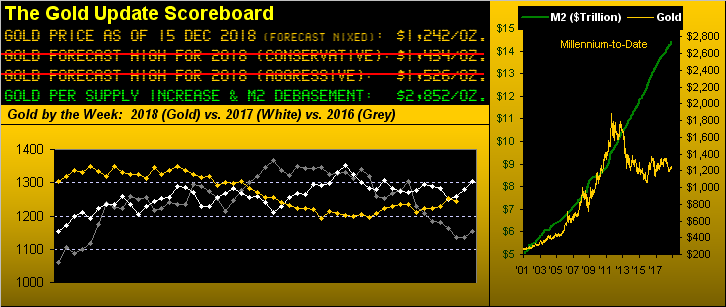 So here comes "Fed Week". Given the bank's present Funds rate of 2.250%, but the market's settling yesterday at 2.425%, the Federal Open Market Committee members are doubtless revved up and ready to raise, then off to hide in the Christmas haze. And yet, the week also brings 16 metrics for further Econ Baro daze. So hang onto your Gold as one day 'twill amaze!