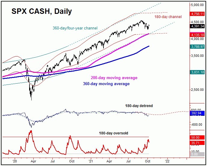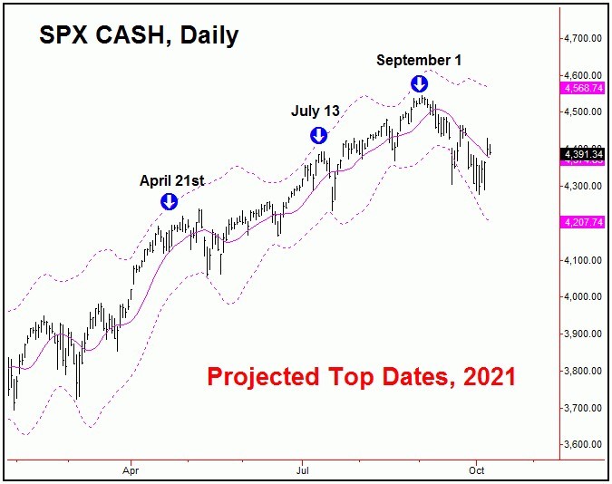 From my 8/15/21 article: "In taking a look at the U.S. stock market - as measured by the S&P 500 index, or 'SPX' - this market is still in the process of forming a mid-term top. That top is expected to come from the combination of the 180 and 360-day cycles. Once this 360-day cycle does top out, the largest decline of the year is likely to follow, with mid-term support around the 200-day moving average on the SPX, if tested."