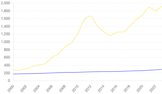 The spot price of gold in January 2000 was around $285 an ounce. If you bought an ounce of gold that month and sold it today, you would earn about 714 percent on your investment.
