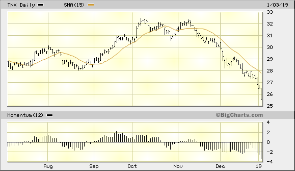 Even more alarming has been the rapidity with which U.S. Treasury bond yields continue to fall. This is distressing to investors because historically whenever bond rates fall below the federal funds rate it has preceded either turmoil in the financial markets or a slowing economy. Shown here is the 10-Year Treasury Note Yield Index (TNX) which fell by 4% on Thursday to 25.54. This reflects a 2.55% yield on the 10-year Treasury note and is very close to the 2.4% fed funds rate.