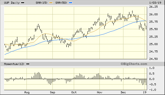 In conclusion, gold continues to enjoy strong support from high levels of fear generated by the weakening global economy. Its all-important currency component also continues to improve, though more improvement would be welcome in the form of an even weaker dollar. On a strategic note, traders should remain long the iShares Gold Trust after recently taking some profit. I recommend raising the stop loss for the remainder of this trading position to slightly under the $12.10 level on an intraday basis. A violation of $12.10 in the IAU would mean that price has fallen under the technically significant 15-day moving average, in turn signaling a shift in the immediate-term trend.