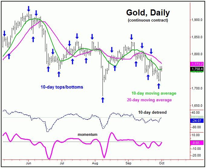 For the near-term picture, as noted last weekend another short-term low was due to materialize for Gold, coming again as the result of the 10-day cycle, shown below: