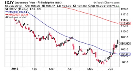 The Dollar Index has put in what looks like an important top, losing 4% and dropping below its 200 day moving average. At least some of this is due to the bounce in the Yen. Traders closing Yen short/Dollar long positions certainly accounts for some of the move. It’s also part of the reason precious metals have reacted so weakly to the Dollar move.