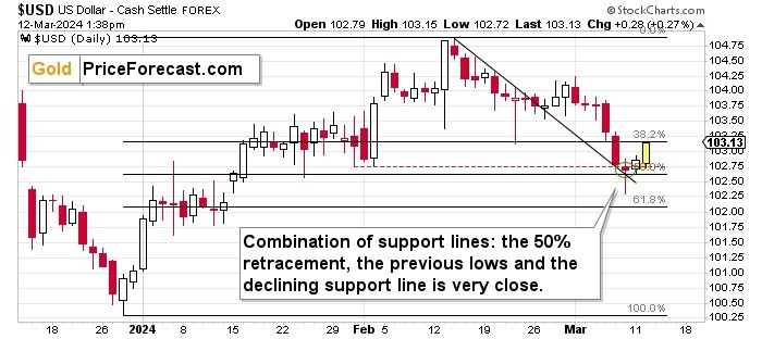 Before anyone says that the rates might fall in the U.S. and this would make dollar decline, please note that the same thing is the case globally – the ECB just provided the same no-rate-cut-yet-but-sometime-in-the-future narrative. The USD Index is an index that is based on several currency exchange rates, so it’s value is driven by how well the U.S. currency does relative (!) to other currencies. If the situation is bad for the USD but it’s worse for other currencies, the USD Index would be likely to rally, because in relative terms, the USD would be a better choice.
