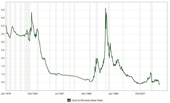 The second chart shows the ratio of the gold price to the monetary base. The two huge spikes toward 5 mark the tops of the last two major bull markets in gold. Notice how this ratio has barely climbed above 1 during the current bull market, suggesting that gold has much higher to climb in order to account for all of the money that has been printed since the financial crisis.