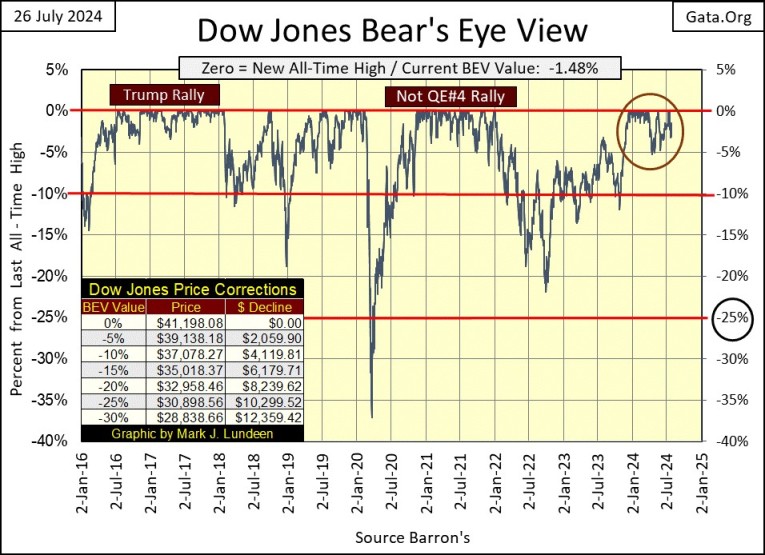 So, for you bulls out there, have fun for as long as the Dow Jones remains above its BEV -5% line, or above 39,138 in dollar terms. Should (when) it closes below that, or maybe its BEV -7% level (38,300), I’d get the hell out of Dodge City, and sell everything that wasn’t a precious metals asset. Doing this would get an investor out within 10% of the top of a major bull market, a market feat only a few investors accomplish, something one could boast about for years to come.