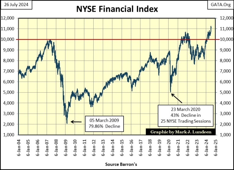 In March 2020, during the March-2020 Flash Crash, in a selling panic this financial index deflated by 43% from its highs of the previous month, in only twenty-five NYSE trading sessions. I suspect the NYSE Financial Index would have deflated much more over the next twenty-five NYSE trading sessions, had not in March 2020, FOMC Idiot Primate Powell began his Not QE#4.