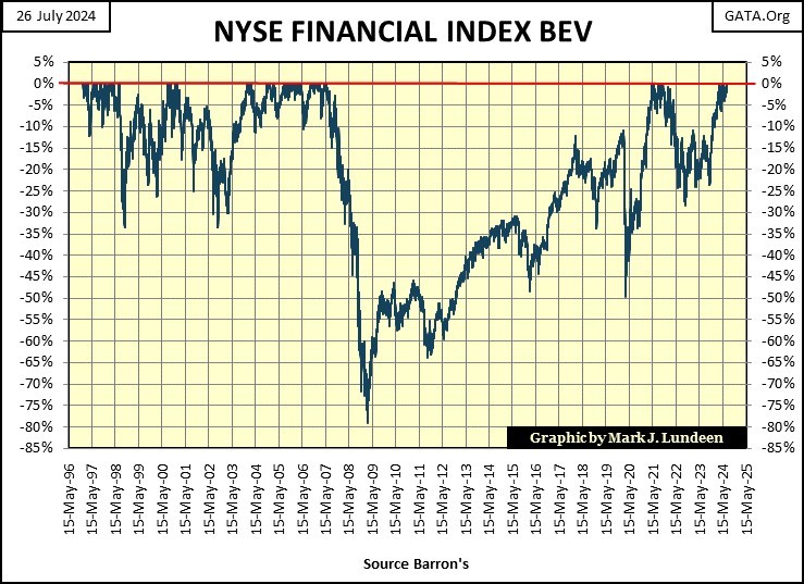 During the high-tech boom, the NYSE Financial Index did make BEV Zeros (new all-time highs), but also saw claw-backs of 25% and greater. During the high-tech bust, this financial index was clawed back by Mr Bear by over 30% from its last all-time high. About the same as the deepest correction it saw during high-tech boom.