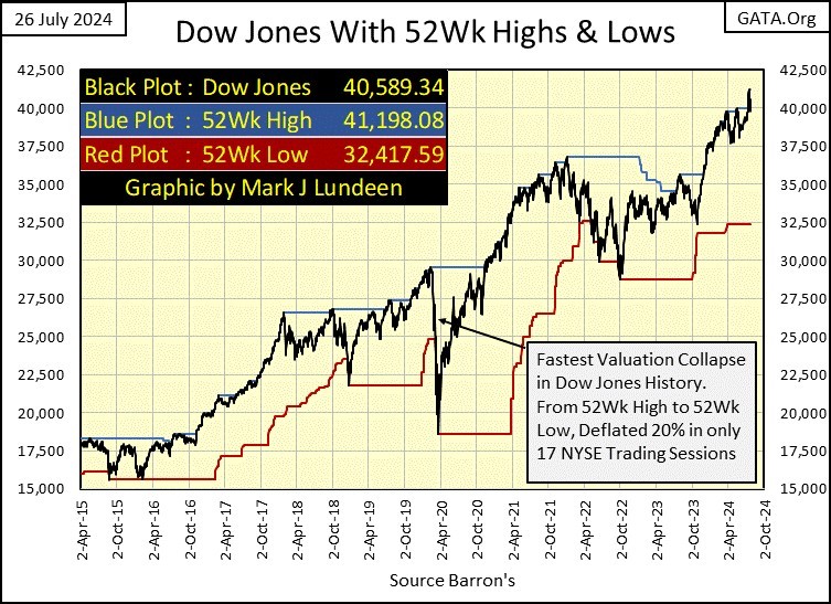 Here is a chart I haven’t published since last winter; the Dow Jones with its 52Wk High and Low lines. The last time the Dow Jones pushed down on its 52Wk Low line was in October 2022. But since last November, it has pushed its 52Wk High line to well over 40,000.