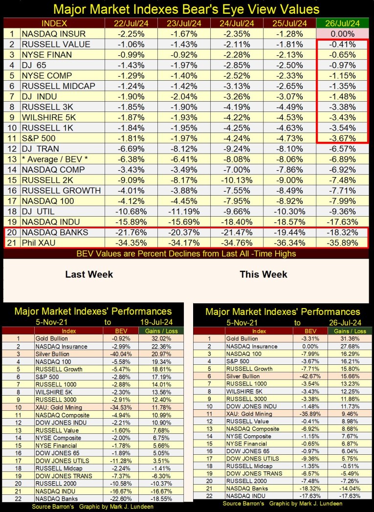 So, how did the week go for the other major market indexes I follow below? Looking at their BEV values, the market was down this week, with only one new all-time high on Friday, for the NASDAQ Insurance Index, this week’s #1.