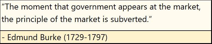 And what is that “principle of the market?” That market prices are set by the give and take of those who bring to the market something they desire to sell, and those who take from the market something they desire to buy, free from any interference from those who neither produce nor consume this something offered in the market, as per Burke: government.