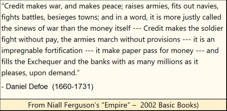 Finance as an industry is hugely influenced (regulated) by “government policy,” as mastery over finance (credit creation) allows “the policy makers” to accomplish amazing things. As noted by Daniel Defoe from the 18th century, a quote I got from Niall Ferguson’s excellent book “Empire.”