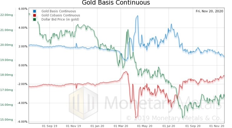 During that time, the cobasis (our measure of gold’s scarcity to the market) held steady as the dollar dropped (i.e. the price of gold went up), then fell a bit as the dollar fell, and it has been rising since July. It is now higher—gold is now scarcer—than when the dollar was 22mg (i.e. gold was $1,410).