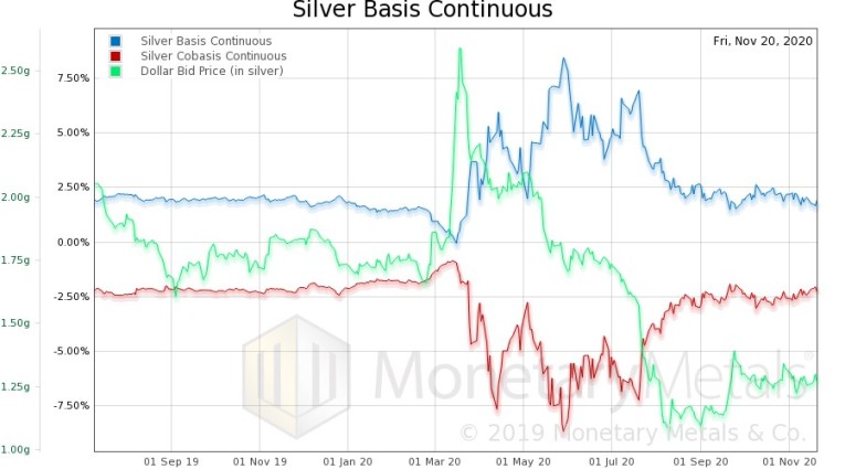 The overall shape is the same. But note two differences. One, the absolute level of the cobasis is around -2.5%. Whereas for gold, it is -1.1%. Two, the cobasis in silver is not higher now than in July 2019. It is about the same.