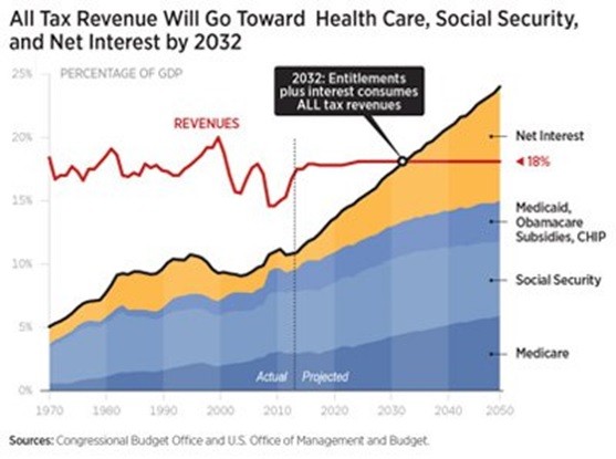 Once you rule out cuts in military and entitlement spending, as most Republicans do, what’s left on the table to cut is small potatoes. Going after waste, fraud, and abuse isn’t going to stop the bleeding of red ink as millions of Baby Boomers withdraw from the workforce and expect to collect trillions in unfunded benefits that have been promised to them.