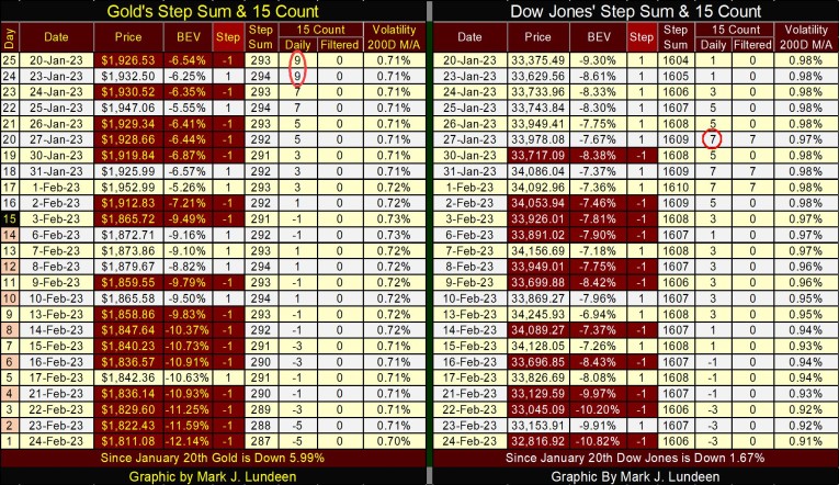 Moving down to gold’s step sum table below, gold with its 15-count of +9 was a very overbought market a month ago. Markets don’t like being very overbought, and typically sell off from this extreme condition. At the close of the week, with gold’s 15-count now a -5, gold is ready to once again begin to rise in valuation. But a -5 isn’t an oversold market.