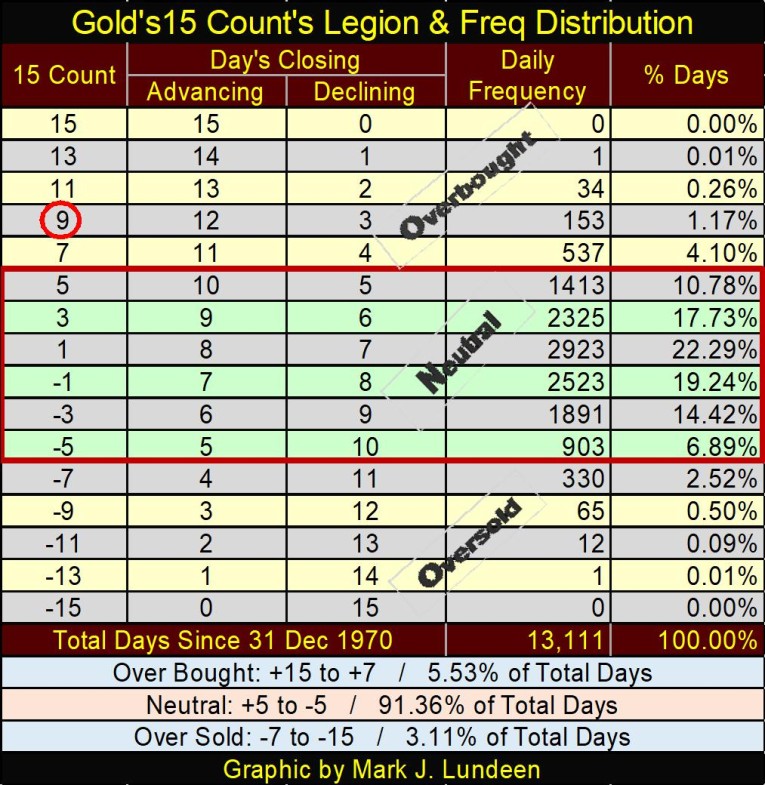 Below a table listing gold’s 15-count legion, and the daily frequency distribution for each 15-count value since December 1970. If gold closes down on Monday next week, its 15-count will be a -7, which is an oversold market. Since December 1970, gold’s 15-count closed at a -7 for only 330 daily closes, or 2.52% of all daily closings.