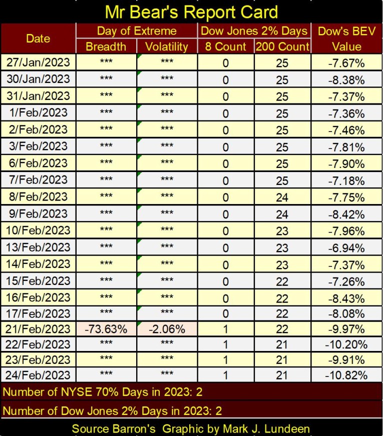 What do I think, how the Dow Jones will deflate to lower valuations? I’m leaning towards the Dow Jones deflating downwards in a violent fashion, maybe sometime in the next few months, simply because on Tuesday, Mr Bear left his calling card at the NYSE, with his second NYSE 70% A-D day for the year. As did the Dow Jones, with its second 2% day for the year (Mr Bear’s Report Card below).