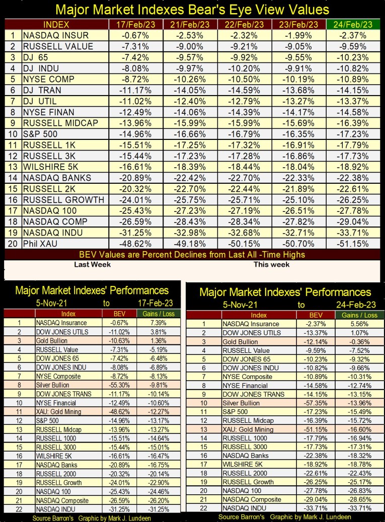 Looking at my table of Major Market Indexes BEV values below, since last Friday, these major market indexes have each lost a couple percentage points in their valuation. One market fact that’s becoming obvious, to me anyway, is that this is a market that’s beginning to find that it’s easier going down than going up.