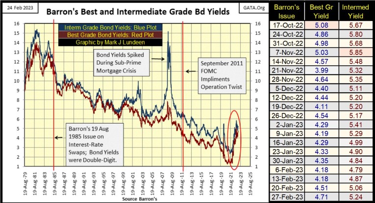 Corporate bond yields (below) continue rising off their lows of a few months ago, as seen in the table of yields to the chart’s right. Having these yields once again rising is a very disturbing trend to observe, as a bear market in debt is noted by rising rates and yields. And we aren’t going to have a bull market in stocks, when the bond market is in a bear market. Look at the spike in yields these bonds had from January to October / November 2022. What that tells me, is that something fundamental has changed in the bond market, fundamentally not good for the bulls.