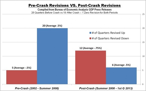 However, logic would dictate that revisions would fall equally in the up and down categories. After all, government bean counters are expected to report objectively, not to create a narrative or manage expectations. If anything, I believe that the public would be better served if they would adhere to the conservative playbook of under promising. That is exactly what they seemed to be doing before the economic crash of 2008. From 2002 to mid-summer 2008, the BEA revised initial GDP estimates a total of 25 times, 80% of which (20 revisions) were higher than their initial estimate. However, the average amplitude of the upward and downward revisions were equal at .5%. The difference may have been a function of the relatively strong economy that the nation saw over that time (which I believe was a result of the unsustainable and artificial housing boom). See the chart below.