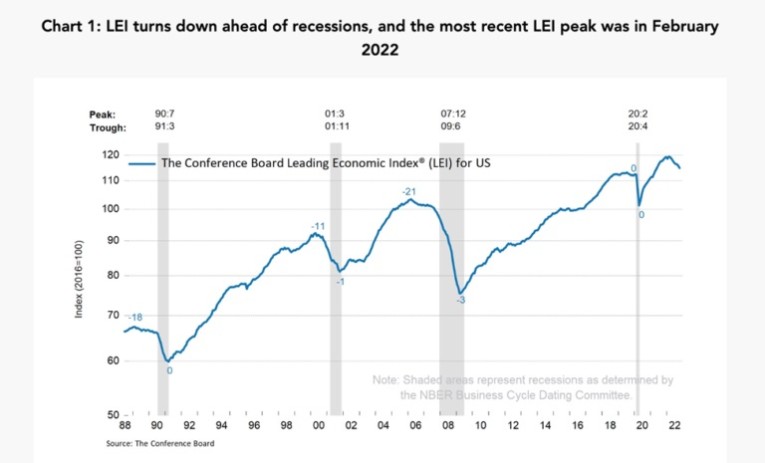 The “Leading Economic Index” (LEI), published monthly by the Conference Board, is a leading indicator for turning points in the business cycle. It successfully predicted the 2001 dot-com recession and the financial crisis.