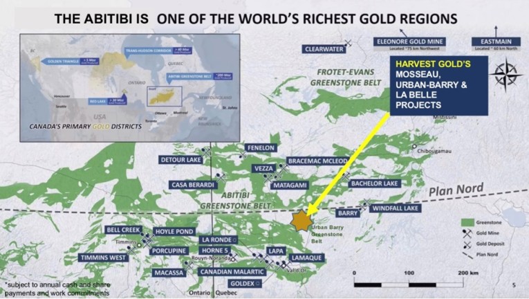 On March 12, 2024 Harvest Gold acquired, through map staking, a continuous block of 60 mining claims southeast of its Mosseau project. The La Belle property overlays the same geological contact as Mosseau and Urban Barry and covers an area of 3,394 hectares.