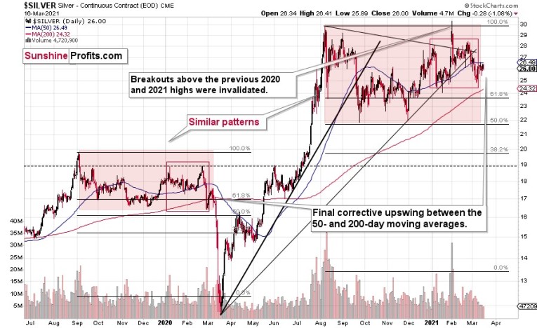 Please note that in both previous (2008 and 2020) cases silver then truly plunged, and it kept on declining until it moved below the 2.618 Fibonacci extension based on the initial downswing. The above charts illustrate that by showing the first decline at the 38.2% retracement (1 / 0.382 = approximately 2.618). Applying the same to the current situation (the initial decline took silver from below $30 to below $24) provides us with the minimum decline target at about $13.50. Will silver really decline as low? In my view, it’s imperative to watch other markets for indications as they might have more reliable targets (for instance gold), but I wouldn’t say that this target (or lower price levels) is out of the question. Of course, that’s just on a temporary basis – silver will likely soar in the following months and years (after this decline).