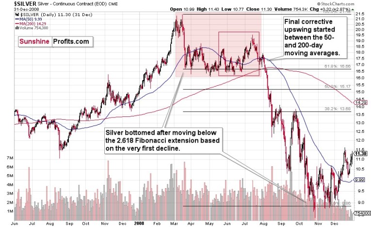 After the top, silver declined, and the final corrective upswing took place approximately between the 50- and 200-day moving averages.