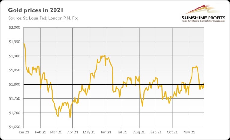 Indeed, the London price of gold dropped on Wednesday below $1,800… again, as the chart above shows. Hence, gold’s inability to stay above $1,800 is disappointing, especially in the face of high inflation and market uncertainty. Investors seem to have once again believed that the Fed will be curbing inflation. Well, that’s possible, but my claim is that despite a likely acceleration in the pace of the taper, inflation will remain high for a while.