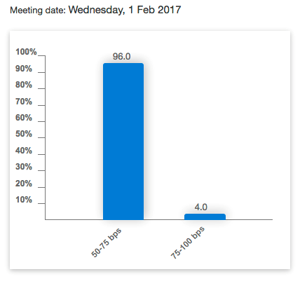 According to the traders who make up the Fed Funds futures, there is no decision tomorrow, either. From CME Group, we have virtually no one predicting two successive rate hikes.