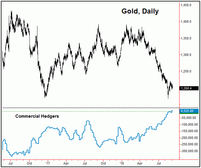 Stepping back, should a drop back to or below the recent lows be seen on the next move lower, then it would be viewed as a strong buy signal for gold. That would be due to the completion of a five wave move to the downside, and would also be due to the position of the commercial hedgers - which have now moved to a net long position in the metal: