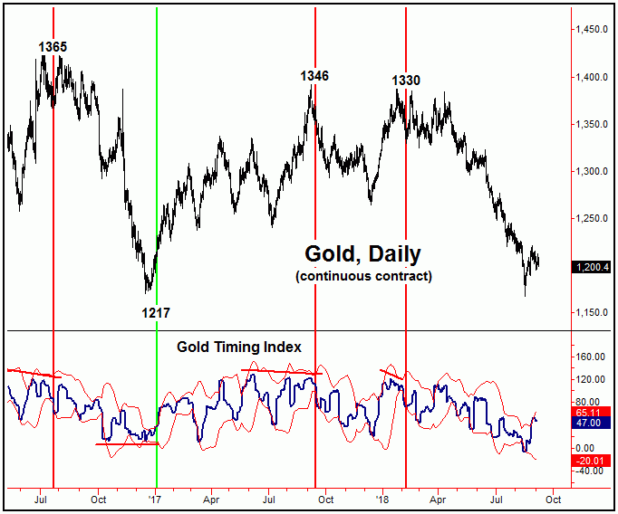 As for our Gold Timing Index, with the close above its upper standard-deviation band on 8/27/18 (i.e., 1216), this indicator is currently on a short-term sell signal - but with the same still looking for a mid-term buy signal at some point going forward. For the latter to materialize, price would need to register a lower low - with the indicator itself forming a 'higher-low'. From there, the actual trigger would be a daily close above the indicator's upper standard-deviation band. We'll see how this plays out in the days/weeks ahead.