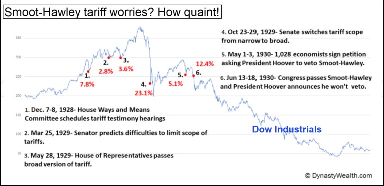 Toward the end of the Roaring Twenties, when Congress was debating passage of the Smoot-Hawley Tariff Act of 1930, investors grew increasingly obsessed with headlines concerning the bill’s odds of becoming law. When it appeared to pick up support on Capitol Hill, stocks would fall; but when the protectionists seemed to lose ground, shares would rise. This time around, facing tariff measures that make Smoot-Hawley look benign in comparison, investors remain not merely unconcerned, but giddy. Stocks rise on most days regardless of tariff news and despite the strident efforts of economists and editorialists to convince us that Trump is about to goad the world into a trade war. Investors must think he’s bluffing, and perhaps he is. If not, don’t be surprised to see the broad averages, along with Bitcoin, get nuked a few months after he takes office.