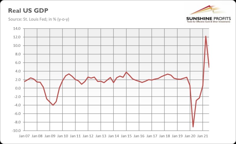 Luckily, better times are coming for gold. Have you seen the advance estimates of the durable goods orders (0.4% decline in September) or of the GDP in the third quarter of this year? According to the BEA, real GDP increased at an annual rate of 2.0% (annualized quarterly growth), much below the 6.7% reported in Q2 and much below the expectations of 2.8% growth. When it comes to the annual percentage growth year-over-year, real GDP rose 4.9% compared to 12.2% in Q2, as the chart below shows.