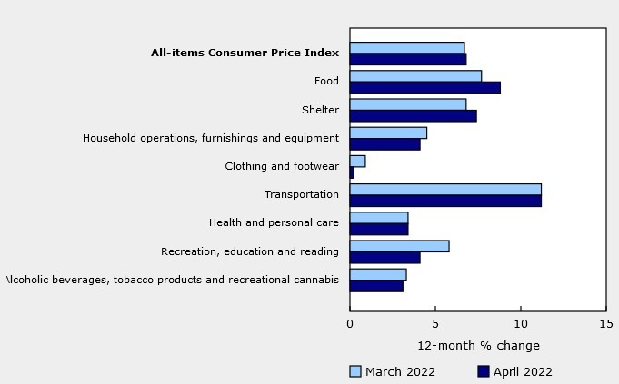 “Canadians paid 9.7% more in April for food purchased from stores compared with April 2021. This increase, which exceeded 5% for the fifth month in a row, was the largest increase since September 1981. For comparison, from 2010 to 2020, there were five months when prices for food purchased from stores increased at a rate of 5% or higher….