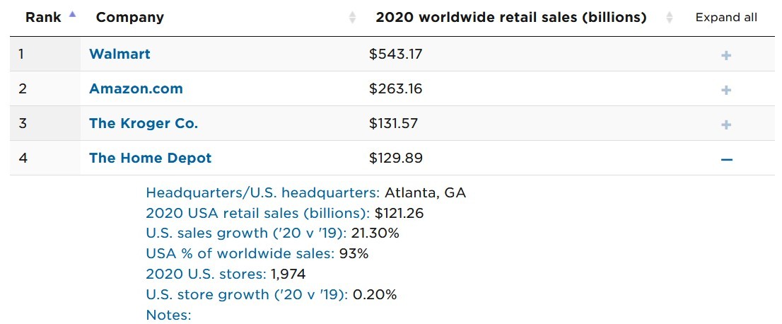 For context, the National Retail Federation (NRF) listed Home Depot as the fourth-largest retailer in the U.S. in its 2021 report. As a result, the company's performance is a reliable indicator of U.S. consumer spending.