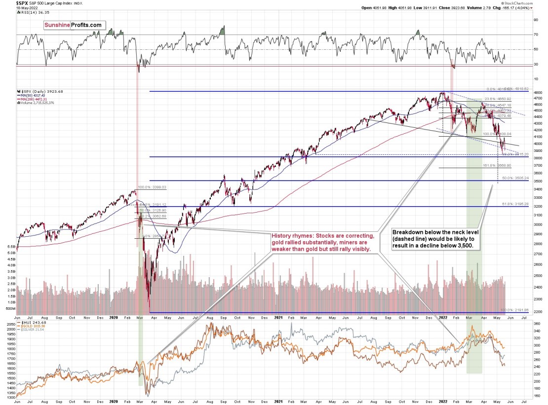 However, let’s keep in mind the fact that miners tend to bottom before stocks do – in fact, we saw that in early 2020. This means that even if the S&P 500 moves to new yearly lows shortly and then bounces back up, the downside for miners could be limited, and the stocks’ rebound could trigger a profound immediate-term rally.