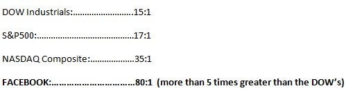 As present day benchmarks for this study (as of May 9, 2014), here are the current P.E.R. of the principal US stock indices vs FACEBOOK: