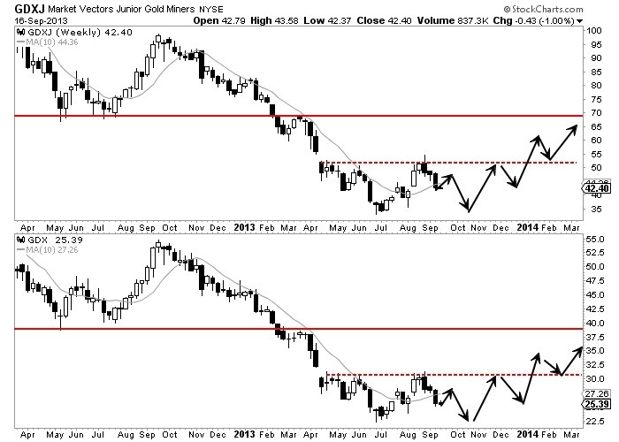 Below is a sketch of how things could potentially play out over the coming months. I say potentially because no one can predict the future. We can analyze history, tendencies and probabilities to come up with a reasonable guess. Given the evidence, I find it reasonable that the sector is not going to breakout anytime soon. At the same time, I find it unreasonable to expect the equities (especially GDXJ and SIL) to make new lows.
