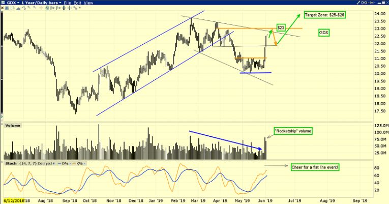 A Friday NYSE close above $23 for GDX, $36 for Newmont, $46 for Agnico Eagle, and $14 for Barrick are what I’m looking for to launch a major run higher for most gold stocks. That may or may not be accompanied by a move above $1370 for gold bullion and a fresh leg down for the tariffs-infested stock market.